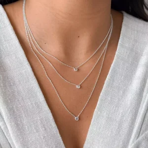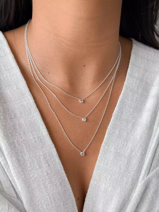 O colar trio de zircônia é minimalista, unindo delicadeza e sofisticação. “Ele cria um efeito de sobreposição elegante e equilibrado, trazendo luminosidade ao colo de forma sutil.” Esse é o tipo de colar perfeito para usar com um decote em V, para valorizar ainda mais o colo. Portanto é ótimo para usar no dia a dia, principalmente no trabalho.