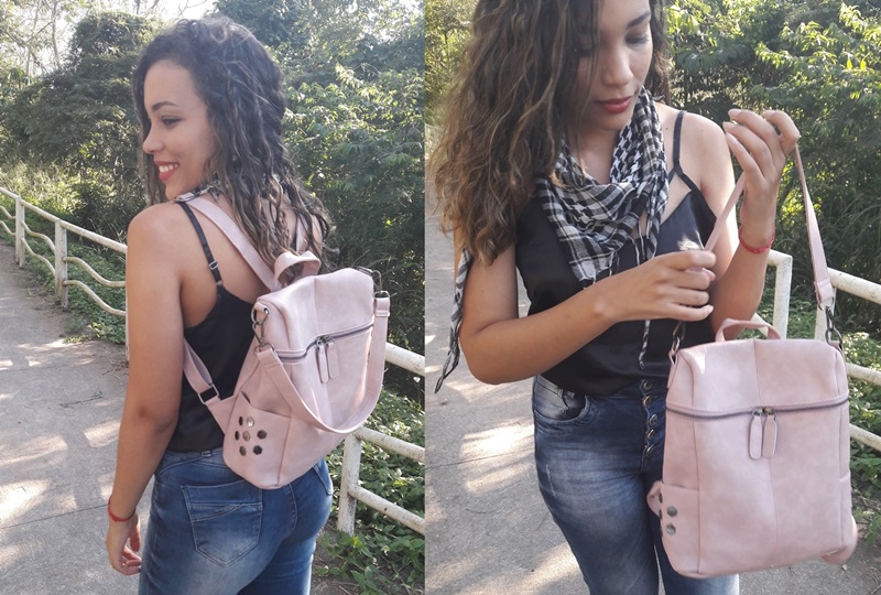 Eu escolhi na cor rosé, mas na loja é possível encontrar esta bolsa nas cores preta, bege e cinza. O que me fez escolher esta bolsa é sem dúvidas a praticidade. Ela pode ser usada de duas maneiras, como mochila ou bolsa de lado.