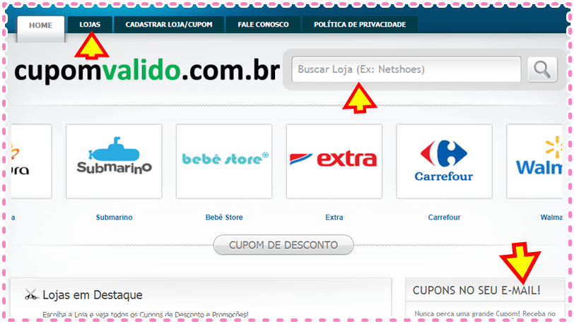 Logo na primeira página ainda podemos observar as lojas em destaque e muito mais. Confira abaixo algumas das melhores lojas nacionais e internacionais. É muita loja, consequentemente muito cupom para aproveitar.