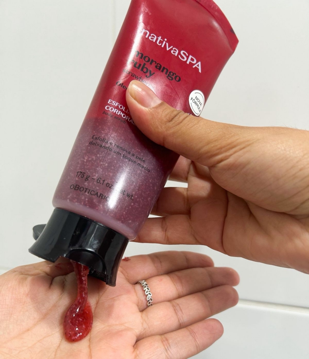 O esfoliante Corporal Morango Ruby do Boticário foi uma agradável surpresa. Porque, no início, ele te ganha só pelo aroma. Mas ao aplicar, a sensação é de muita suavidade, pois espalha-se facilmente pela pele. Além disso, ele vai fazendo uma espuma agradável que deixa a pele macia de forma fácil.