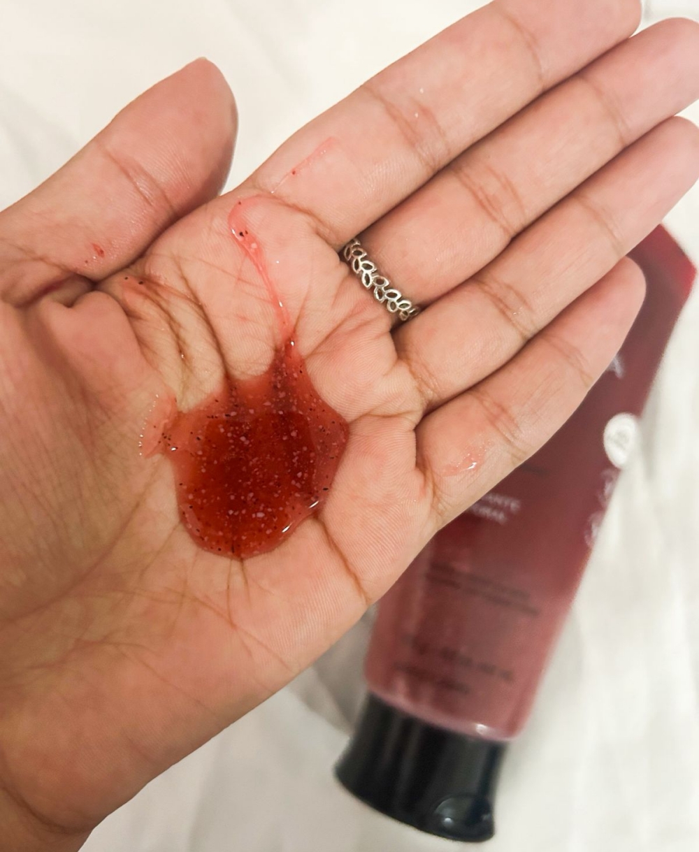 O produto possui uma textura gelatinosa e com bastante granulados. A cor é vermelha, o que remete ao morando. Pode ser usado de 2 a 3 vezes na semana.