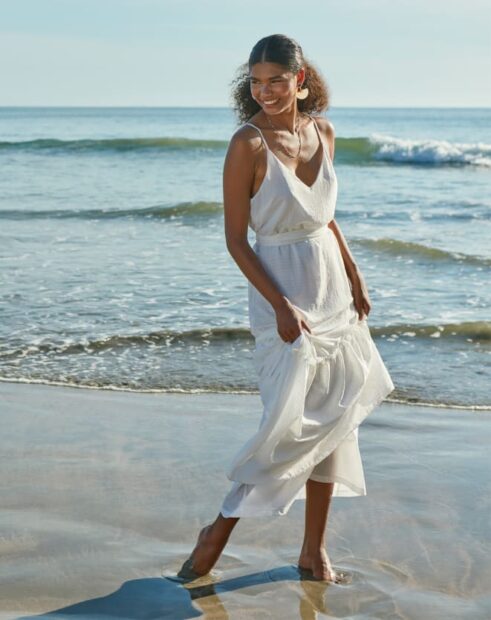 Os modelos de vestidos longos, para mim, são sempre a escolha perfeita para uma virada de ano. Pois são lindos, cheios de charme e muito confortáveis. Procure investir em vestidos mais fluídos como o modelo abaixo. Este vestido possui cintura marcada, alças finas e recortes, que deixam um caimento lindo no corpo.