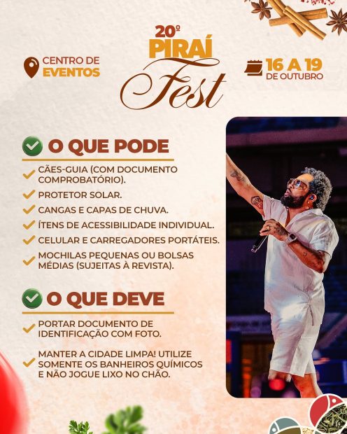 O Piraí Fest 2025 está de volta; este evento celebra a cultura, a música e a gastronomia com uma programação diversificada e divertida para toda a família. Então, anote os horários dos seus shows preferidos e não perca nada. A festa ocorre do dia 16 ao dia 19 de outubro, trazendo muita alegria e grandes shows para o coração da cidade.