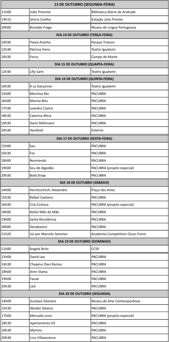 SPFW Academy – Esta é uma novidade, uma experiência que vai apresentar como são os processos de criação da semana de moda. Mas também conta com protagonistas da história do evento. Como O estilista João Pimenta, o idealizador do SPFW Paulo Borges, a maquiadora Vanessa Rozan, entre outros talentos.