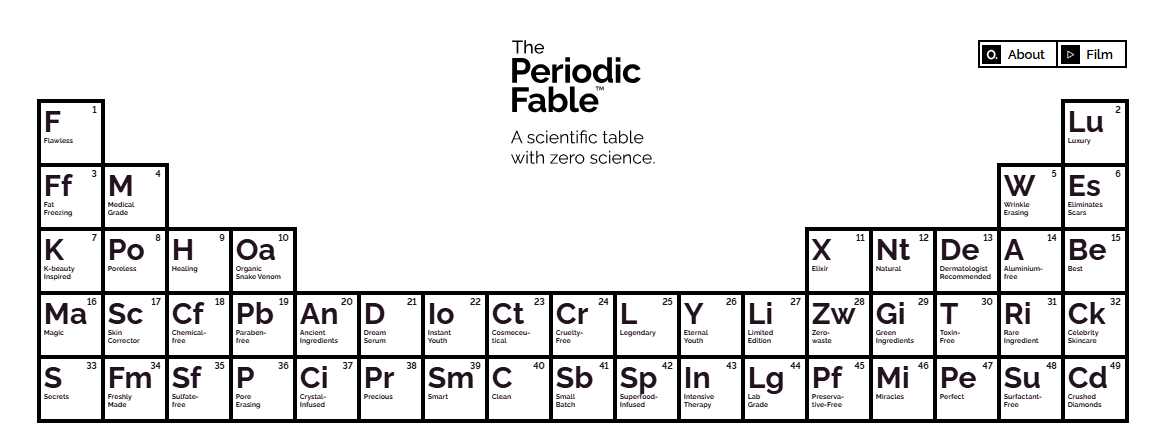 A marca apresenta a tabela com 49 termos/buzzwords da indústria da beleza que soam científicos, poderosos, “milagrosos”, mas que segundo a marca não possuem comprovação científica. Ou seja, isso pode iludir e enganar os consumidores. A mensagem da propaganda ainda reforça que muitas pessoas consomem e incluem tendências em suas vidas, sem reflexão, sem saber se de fato é algo seguro e eficiente.