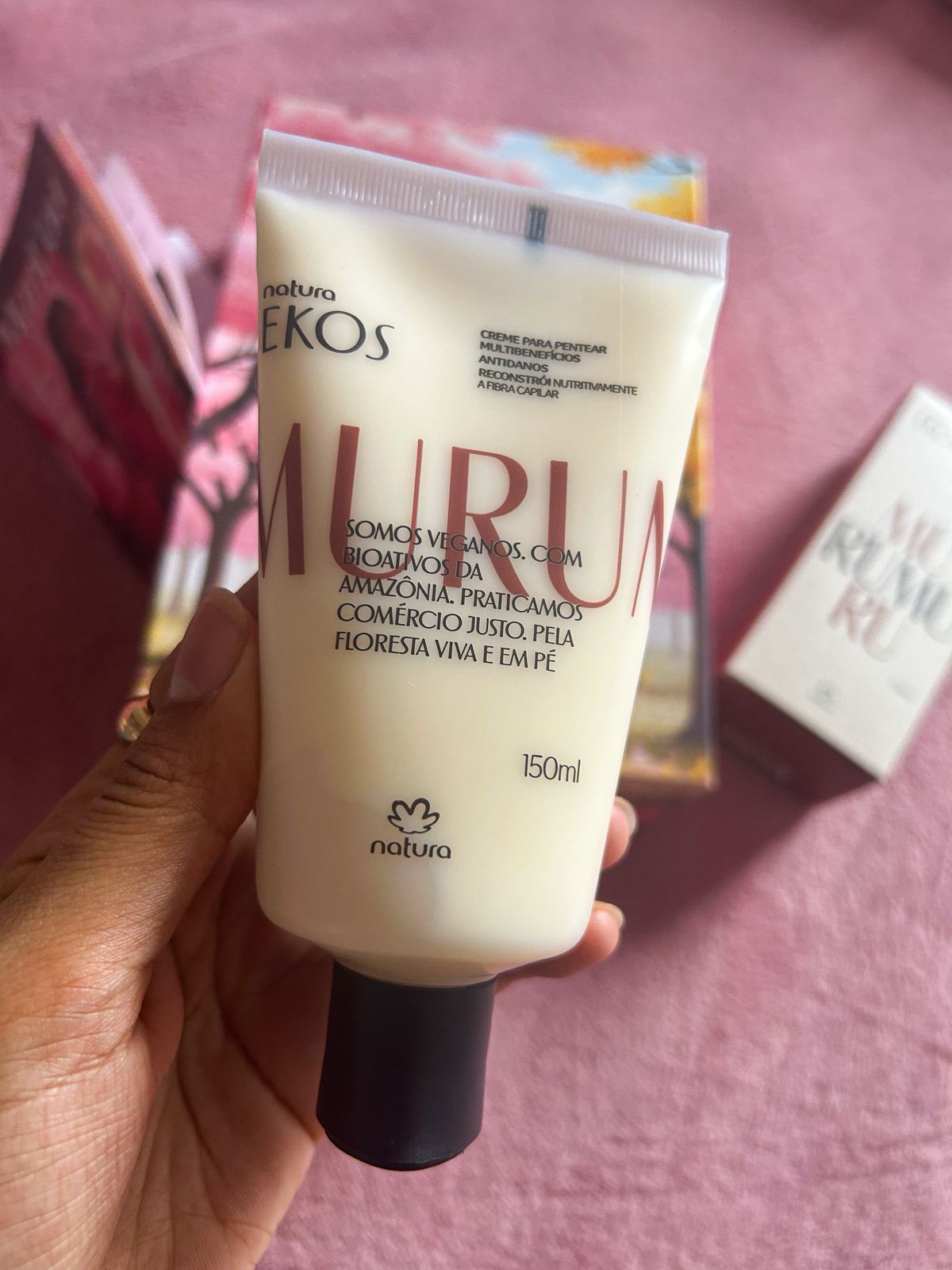 Creme para pentear Natura Ekos: Este creme possui a força da manteiga bruta de murumuru. Então ele combate o ressecamento e repara os danos capilares com um toque de maciez e brilho natural. Possui ainda ação antidanos intensa, reduz pontas duplas em até 3x, controla o frizz por até 24 horas e ainda cria uma barreira protetora contra o calor do secador e da chapinha. Portato o resultado são fios mais fortes, alinhados e radiantes. Produto Vegano.